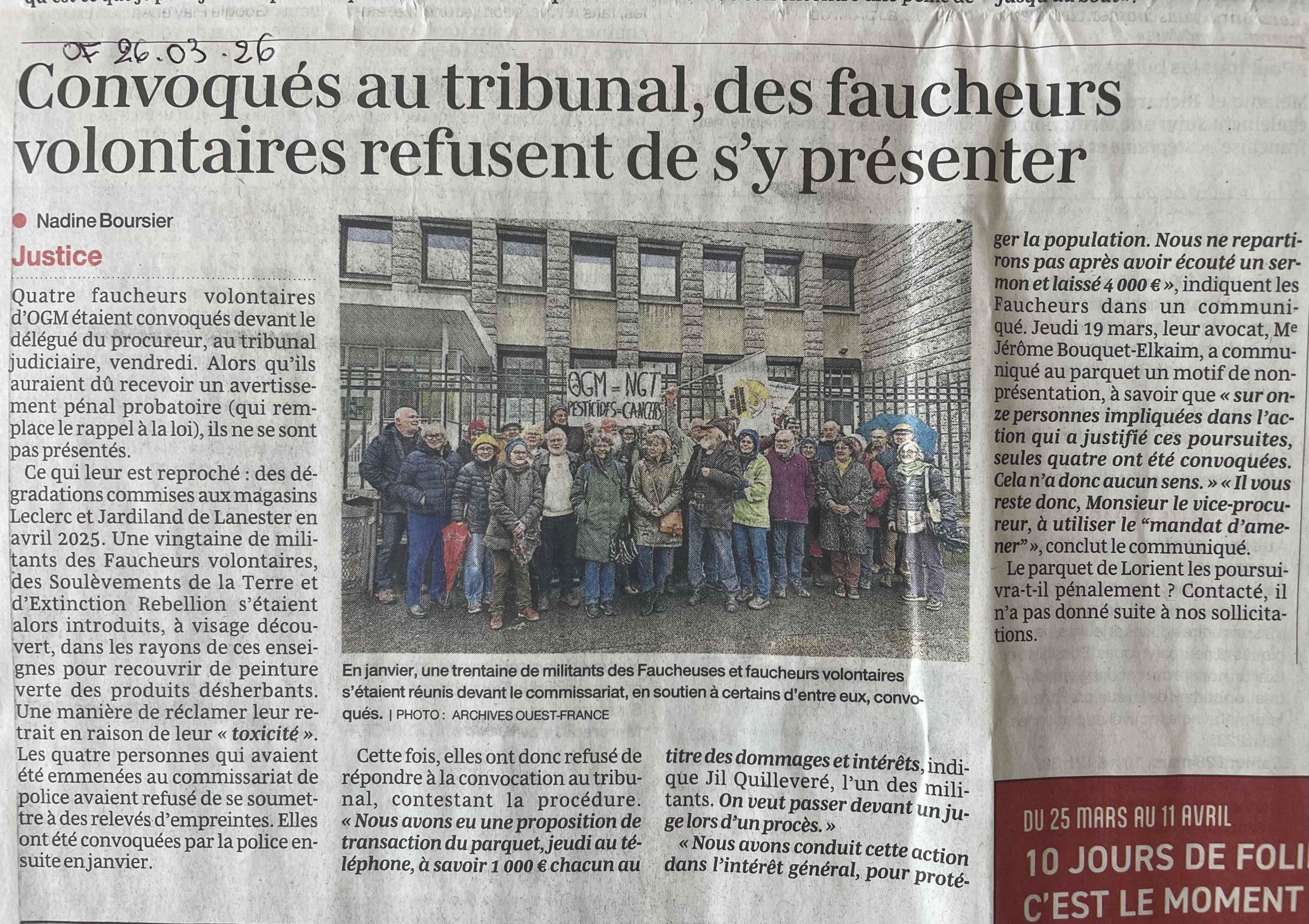 Les 4 Faucheuses et Faucheurs d’OGM-NTG de Bretagne n’ont pas déféré,